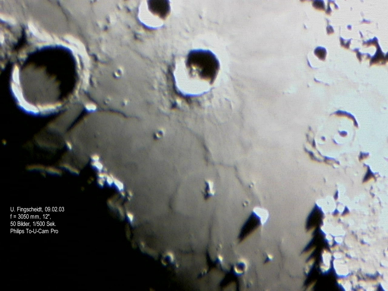Mond. 09.02.2003. Meade LX200GPS 12". Philips ToUcam Pro, selbst SC-modifiziert, 5/100 Sek.. 50 Frames, gestackt mit k3ccdtools. © Dr. U. Fingscheidt.